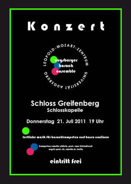 Seien Sie herzlich eingeladen, unser Konzert in der Schlosskapelle Greifenberg zu besuchen. Wir freuen uns darauf, in dieser idyllischen Umgebung in der wunderschönen Schlosskapelle zu musizieren. In idealer Weise werden die Eindrücke von Auge und Ohr verschmelzen können - innerhalb einer kurzweiligen Stunde Barockmusik! Das Programm in Greifenberg orientiert sich an den Platzverhältnissen der recht kleinen Schlosskapelle. Wir musizieren auf der Empore daher in der kleinsten Besetzung unseres Ensembles: mit 2 Trompeten und Orgel. Die Werkauswahl ist sehr abwechslungsreich, nicht zuletzt durch verschiedene Klangfarben, die durch die Verwendung von Barocktrompeten sowie Piccolotrompeten und Flügelhörnern entstehen.